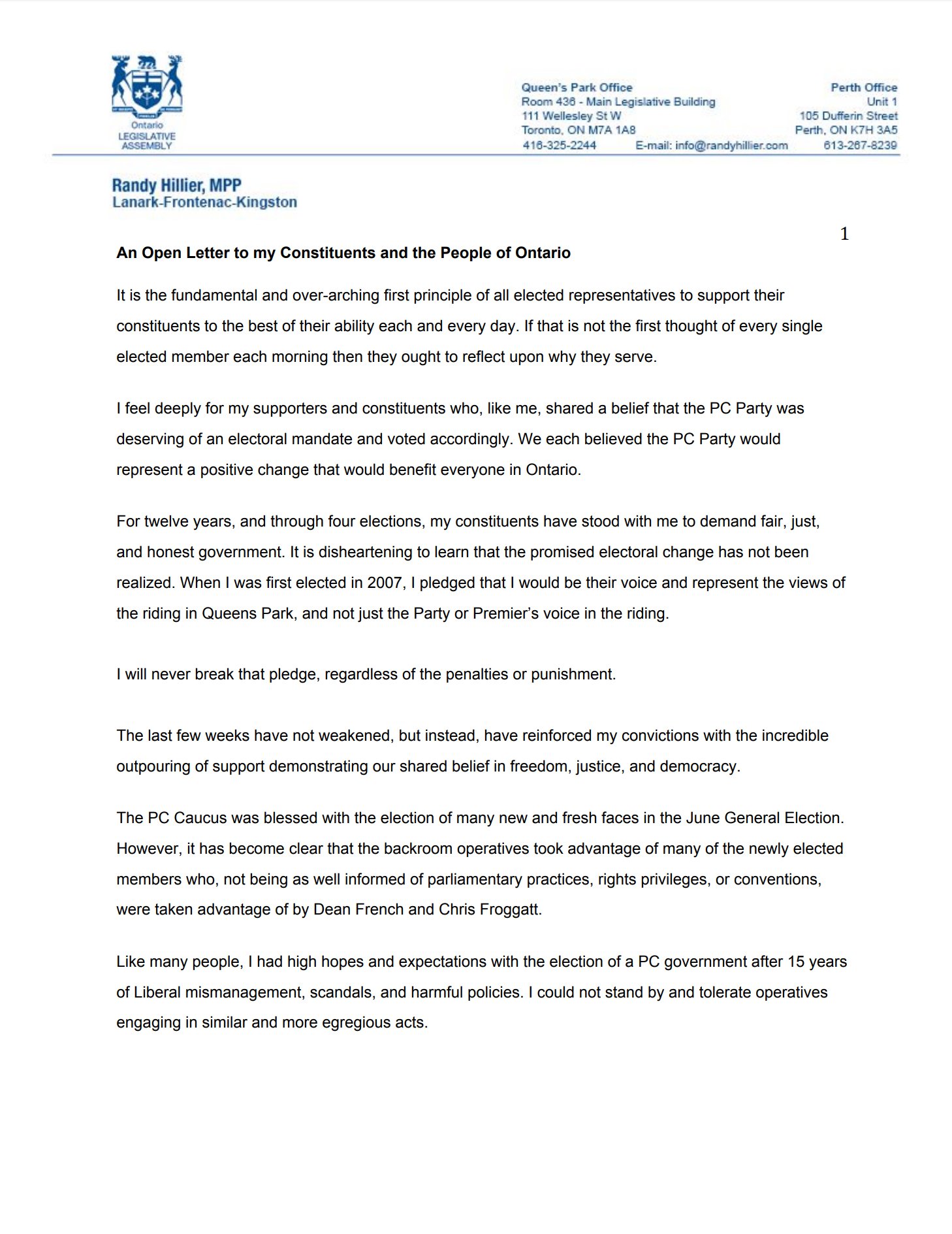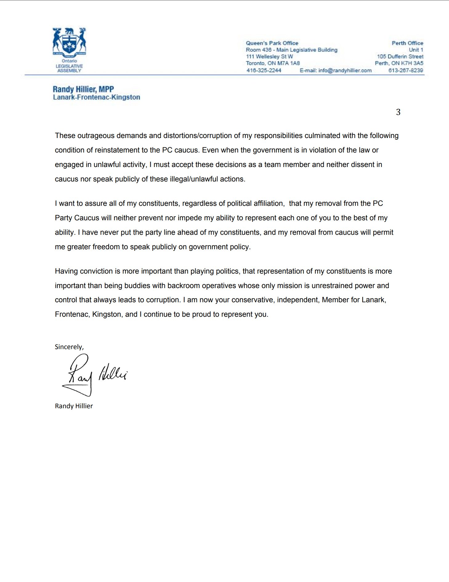 “If any of this letter was true, why didn’t Randy Hillier quit caucus on principle or raise these issues with the Premier. Instead he launched a PR campaign begging to get back into Caucus. He even went as far as launching a website and an e-mail campaign.