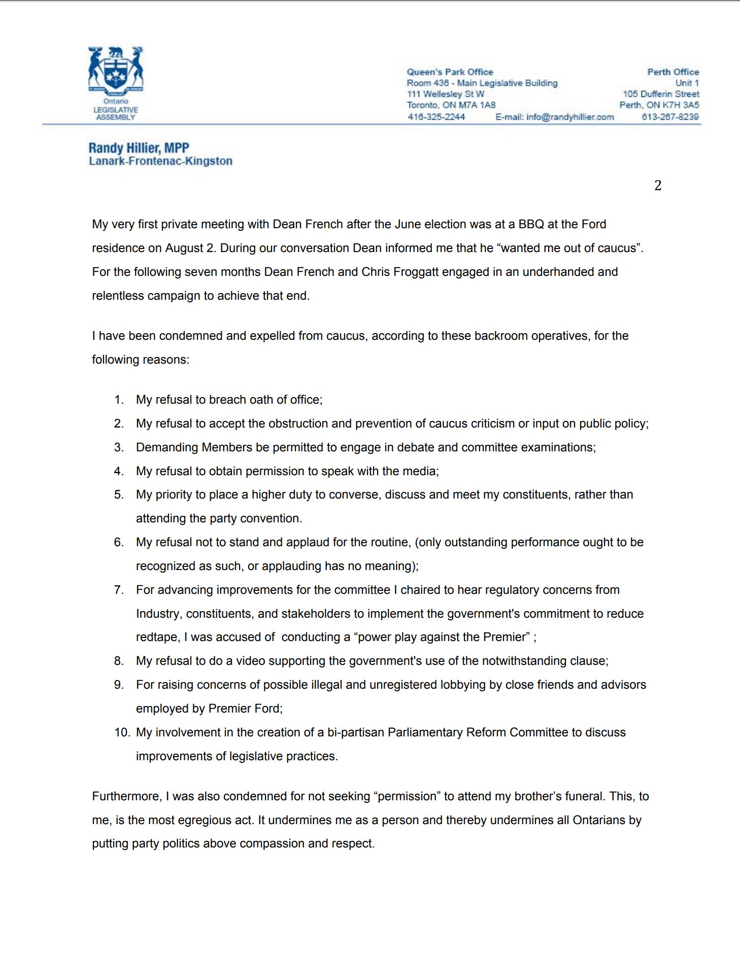 Jefferies offered a point-by-point rebuttal of Hillier's claims and added, "If any of this letter was true, why didn’t Randy Hillier quit caucus on principle or raise these issues with the Premier?"