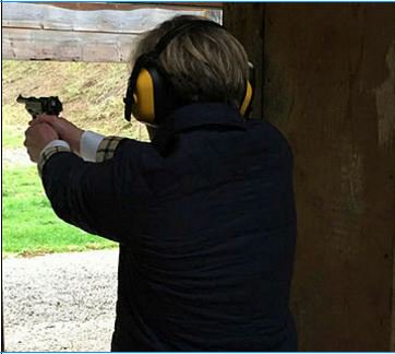 One photo shows her aiming what looks to be the Nazi-era Walther P-38 handgun and another shows her holding up a paper target.