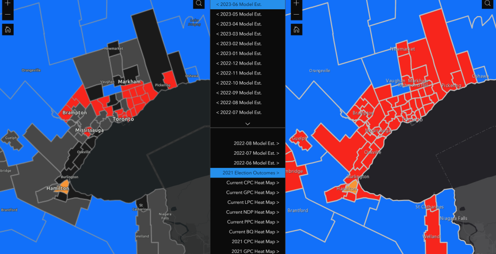 Nanos Research's current seat projections in the GTA (on left), election results in 2021 (on right).