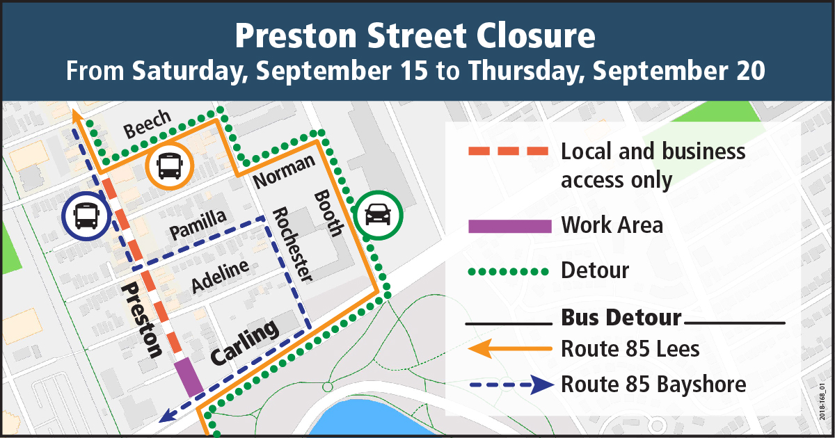 Preston Street from Sidney Street to Beech Street will be open to local and business traffic only. Traffic will be rerouted along Beech Street to Rochester Street to Norman Street to Booth Street to Carling Avenue. All detours will be signed. Access to on-street public parking and parking lots in the area will be maintained.